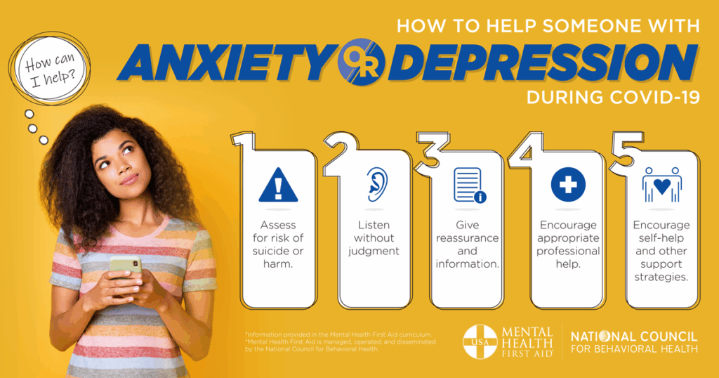 Use these tips from the MHFA curriculum to help someone with anxiety or depression during COVID-19: